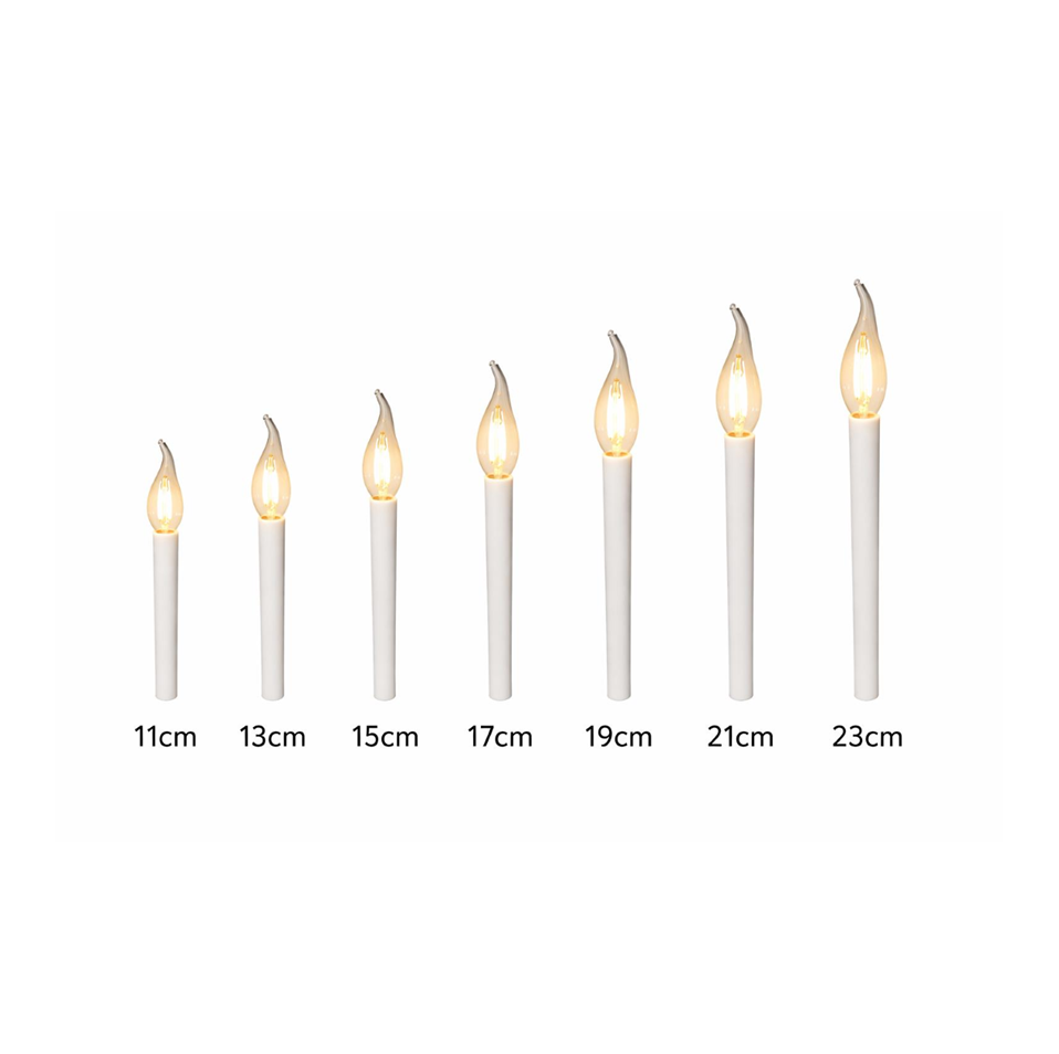 Tapered ivory coloured French GS candles with an E14 lamp holders.